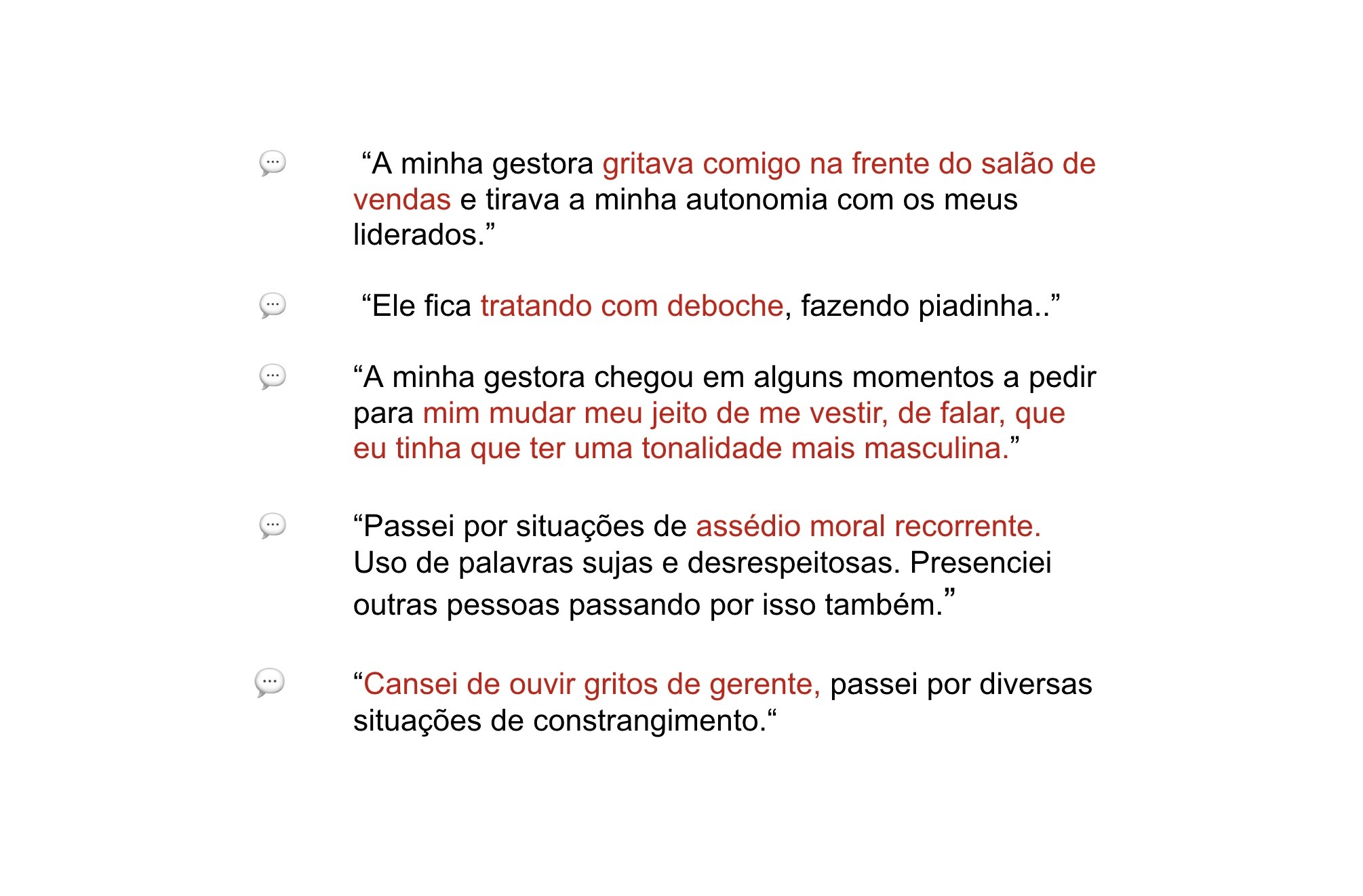 Os relatos expõem práticas e comportamentos que contradizem os valores da organização e minam o senso de pertencimento.