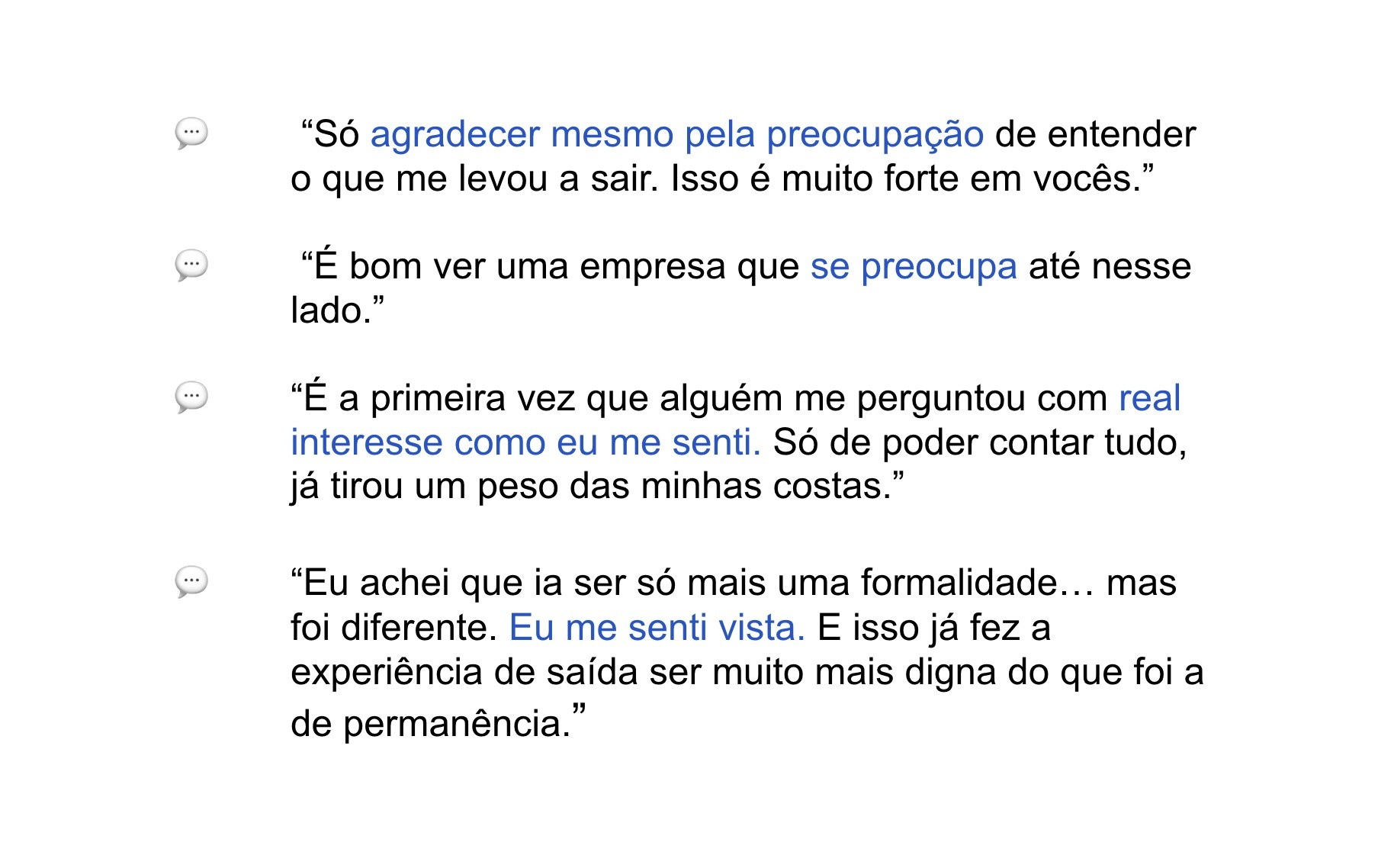 A Entrevista de Desligamento da Numera ultrapassa os dados quantitativos. Além de permitir a análise de padrões por grupos demográficos (área, cargo, tempo de casa, gênero e mais), ela coleta e organiza os relatos de quem saiu. Com isso, o RH ganha profundidade diagnóstica e consegue construir um storytelling claro, detalhado e estrategicamente robusto para orientar decisões.